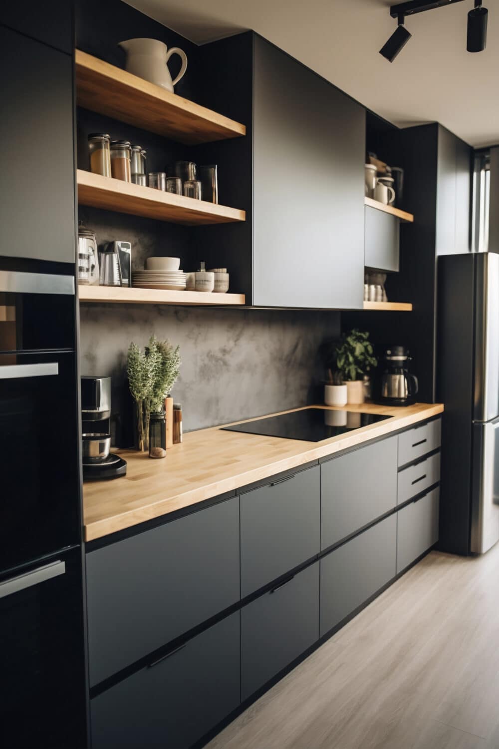 - Des armoires allant jusqu’au plafond pour optimiser l’espace de rangement.